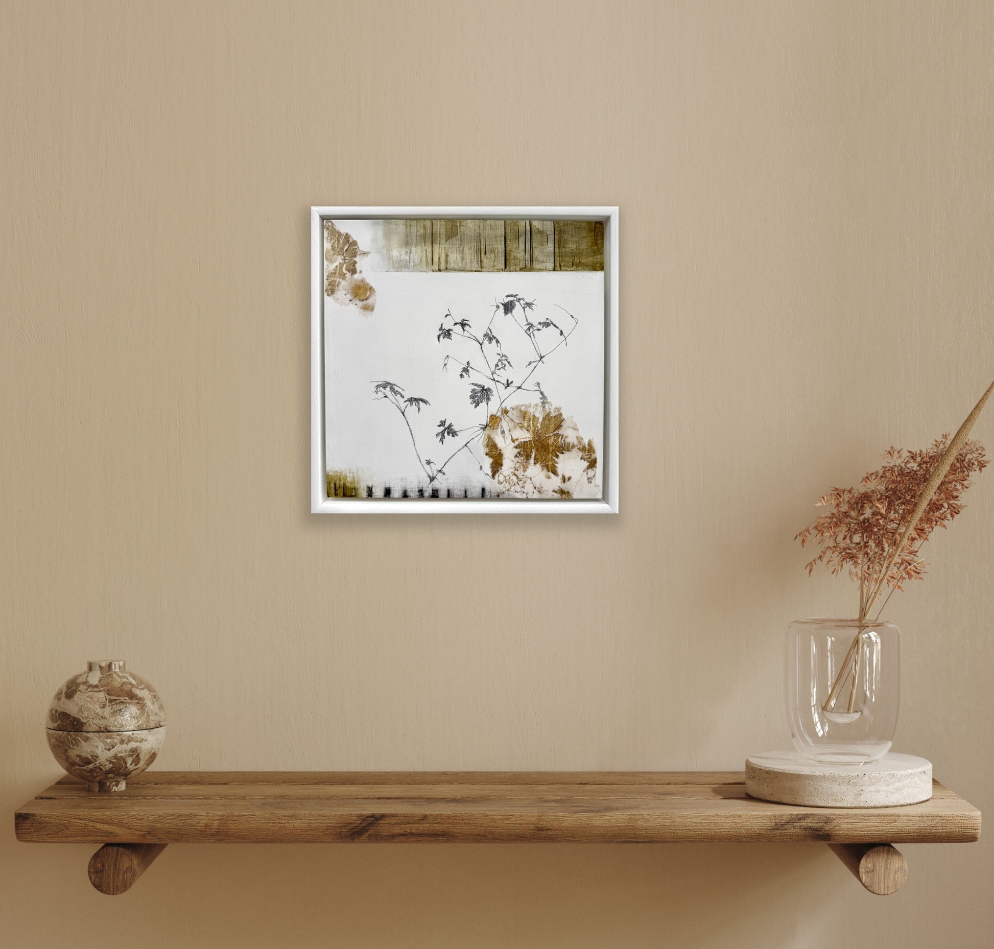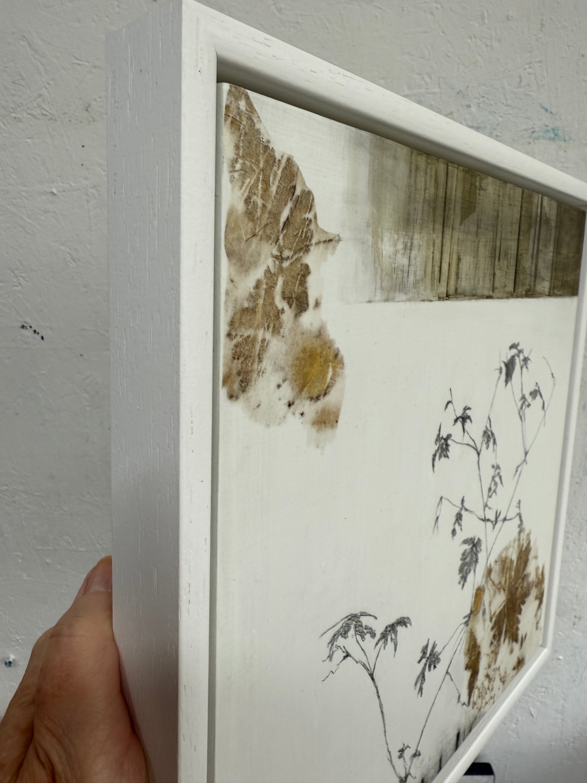 Crafted with eco print collage and graphite, this piece on birch wood panel captures the fragility and fleeting beauty of life. The satin UV varnish and white wooden frame add a touch of elegance to any room. Make a statement about the beauty of the present moment with Ephemeral Impressions.